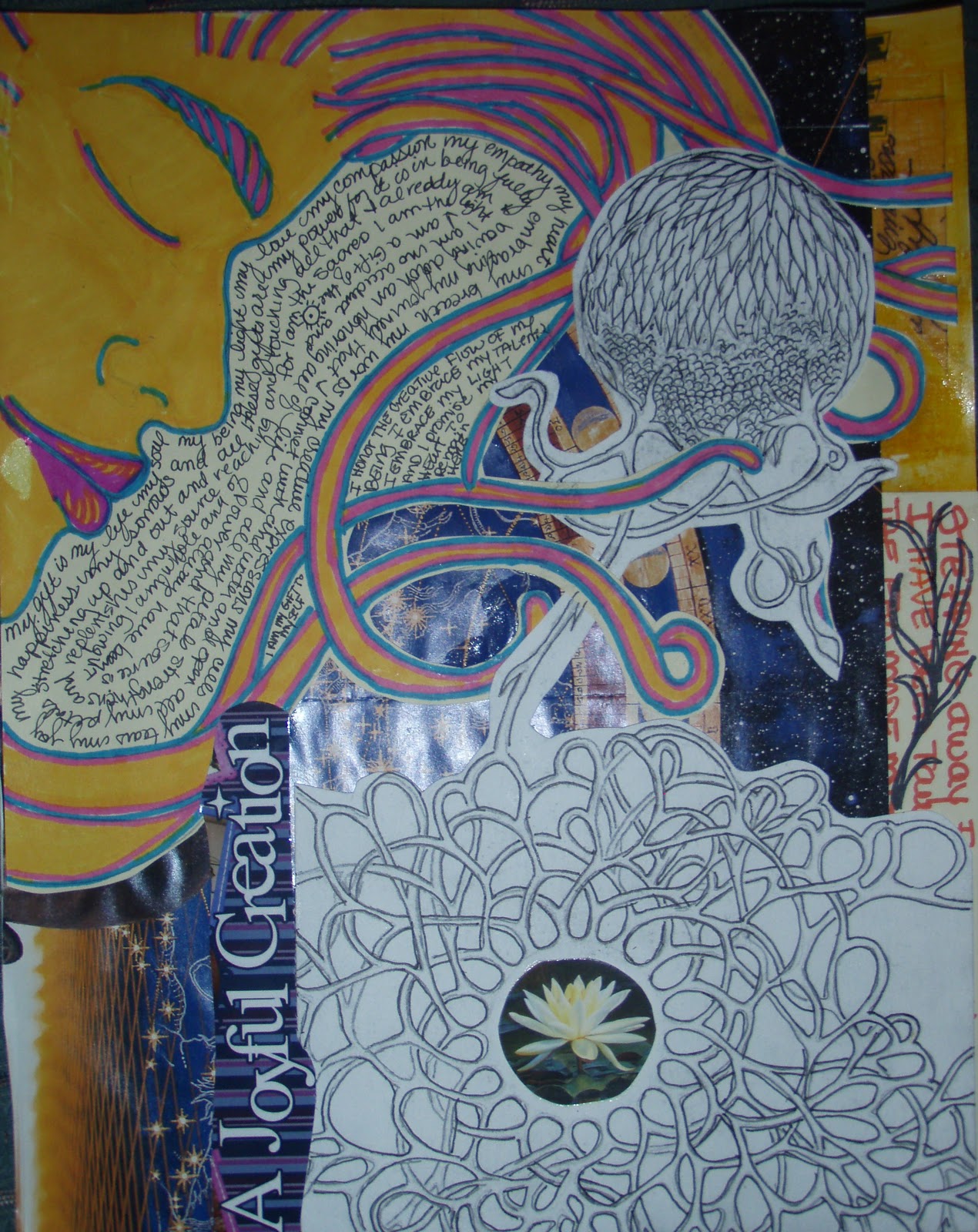 "This collage is me embracing the flower of life. I own every single petal. I own every twisting root. I own every part of who I am. I know I deserve all the joys life holds for each of us. I celebrate in expressing my soul through my art and I own my birthright of Power in a way that only God, The Goddess, The Intelligent Universe understands. I joyfully create and I am filled with gratitude." That was my statement describing my collage when I submitted it to those who were sharing my experience in a class. I am grateful for being pulled up and out of my hardened shell of denial, of my love of translating what I see inside me to an outside experience.