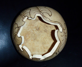 Cutting the top off a gourd can be tricky, and even more tricky when the path the jigsaw is to follow is a curvy one! Before any jigsawing can begin it is necessary to pierce the gourd's body with an awl. The size of the awl is important because the hole created by the awl needs to accommodate my micro jigsaw blade. Once the blade is inserted then the fun begins! The challenge is to retrace the drawn design with an oscillating saw and not accidentally lop off a leaves lobe! With the top successfully removed the gourd can then be cleaned out. Cleaning the inside of a gourd involves the removal of the seeds and the ribs that hold the seeds. Once that is done then I scrape out the gourds remaining contents until I reach the inner wall and then the inner walls need to be scraped until they are as smooth as possible. For detailing the edges I use metal files. Cleaning the inside of a gourd is a very messy job but with the right music playing it is an enjoyable experience!